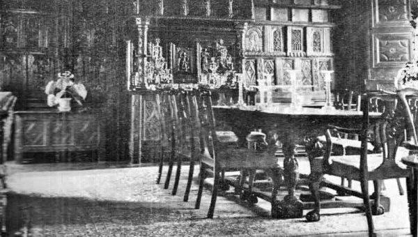 The fine carved doors of the hall are formed of original panels from Guernsey, with new framing. The fresh carving there and in other parts of the hall was done by myself, but from old originals. A great number of old oak chests were broken up and used for the lining of the hall, which though not all of exactly the same time, were thought to be more suitable than any modern work.