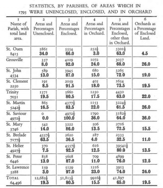 The number and extent of orchards is the most impressive single item of information to be had from the map of 1795. Orchard land accounted for no less than 15.5% of the whole island. It was widely distributed over the plateau, although much more thinly in the west than elsewhere, with a slight concentration in the west centre and a very dense distribution in the east. There were also patches of orchard on the slopes which bound the plateau, as for example in the south of St Lawrence, in Grouville and in St Clement; such sites enjoyed, among other advantages, a favourable aspect.