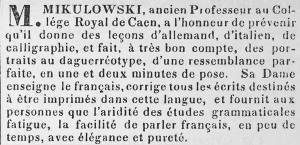 Mikulowski was advertising as a 'Daguerreotype Portrait Painter' at Vauxhall Street in 1845 and at Georgetown in 1847. Then he seems to have given up his photographic business to become the proprietor of the Café de L'Europe in Mulcaster Street and became very involved with the political emigrés of the Island.