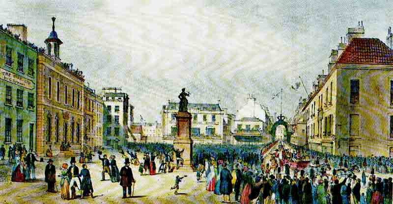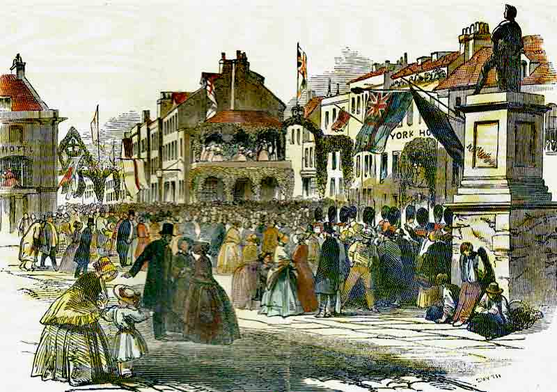 The visit to Jersey by Queen Victoria and the Prince Consort, Albert, on Thursday, 3 September 1846, was surprisingly brief. The Queen, believed to be the first reigning monarch ever to visit the island, set foot on Jersy soil at 11 am, having spent the night on the Royal Yacht anchored in St Aubin's Bay, and departed at the end of the afternoon, after a carriage tour of the island. This was at the very dawn of photography and no photographs of the visit are known to exist. Many paintings and etchings were produced, however, and this one, from the Illustrated London News, shows the large crowd which gathered in the Royal Square to see the Royal Party pass along Vine Street, into Peirson Place and then King Street.