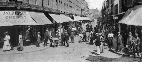 Not only is this one of the best photographs of Broad Street, but taken in 1875, only three decades after photography came to the island, it is one of the best early pictures of anywhere in Jersey. The photograph was one of a number of surviving pictures of the Street taken by Ernest Baudoux and shows clearly that the street was surfaced with cobbles at the time. Remarkably, although the use of many of the buildings pictured has changed over the past 138 years, the general view is much as it is today. The main difference is that a cafe, formerly public toilets, now stands in front of the Le Sueur Memorial, also now surrounded by trees.