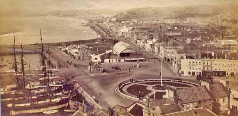 We need four pictures this week to tell the story of the development of the area of St Helier's waterfront which has come to be known as The Weighbridge. There have been two public weighbridges at the town end of St Helier Harbour, both built on reclaimed land. The first, the construction of which was ordered by the States in 1825, was situated next to the Southampton Hotel, as shown in the picture above, taken on a busy day when farmers were queuing with their vans to have potatoes weighed before they could be exported. This picture dates to the mid-1870s, because in 1877 the new, larger weighbridge, further south of the Southampton Hotel, started to be used. It is not known who took this photograph, but it is attributed to both Edwin Dale and Ernest Baudoux by the photographic archive of La Société Jersiaise. The middle picture shows the new weighbridge, at the top of the New North Quay, in front of the terminus of the Jersey Western Railway. This picture dates to late 1889 or early 1890, because the circular gardens have been laid out but the Statue of Queen Victoria, which was unveiled in the centre of 3 September 1890 is not yet in place. The picture shows clearly that the Old Harbour extends as far north as the Albert Harbour behind it. In the first half of the 20th century a substantial section of the top of the harbour was filled in to provide more space for harbour activities and for car parking. Although in everyday parlance the term 'The Weighbridge' covers a large area at the top of the harbour, the only properties which actually bear the address Weighbridge Place, are those in the row in the top picture. In the mid-70s the Southampton Hotel, built in 1864, was a fairly modest structure, which by the time the middle picture below was taken after 1899, had grown an extra story and a much more decorative facade, which survives today, although the business is shortly to close and the interior of the building to be gutted and redeveloped. Next to the Southampton the Weighbridge Coffee Tavern has metamorphosed into the Weighbridge Cafe, and the Weighbridge Hotel alongside it into the Finsbury Hotel. The row is completed by Shaw's Navy Hotel