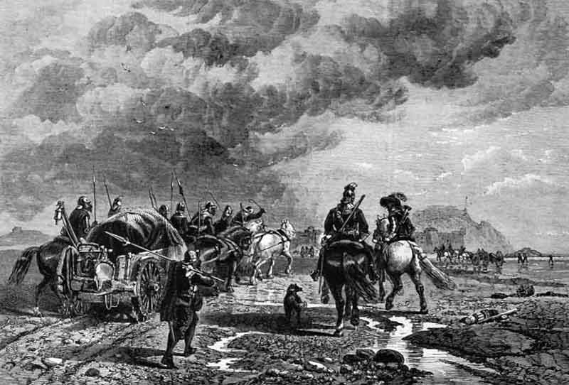 Troops cross the causeway from West Park to Elizabeth Castle during the English Civil War. This conflict had a major impact on Jersey, with political control passing backwards and forwards between the intensely Royalist de Carteret family and their Parliamentary opponents. We have recently added a major new section on the Civil War in the Channel Islands to Jerripedia, including a 1937 article from the Annual Bulletin of La Société Jersiaise, divided into nine parts