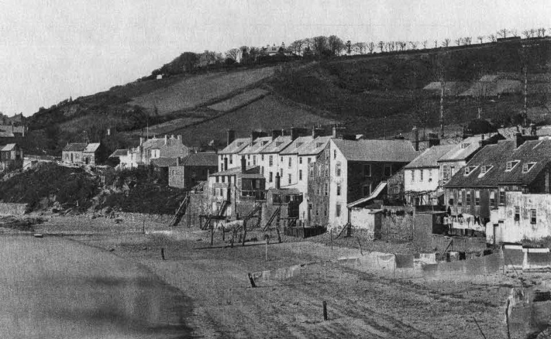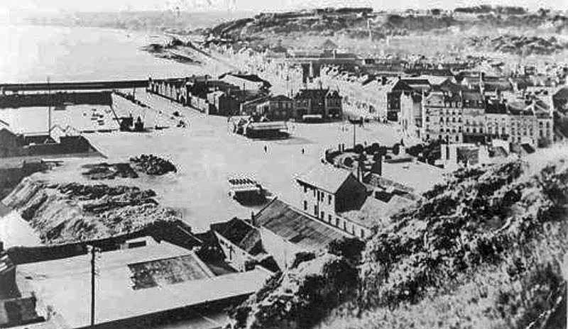 The major land reclamation schemes around St Helier Harbour which started in the last quarter of the 20th century and are still in progress had their origins in the need to find places to dump much of the rubble and other solid waste which the island produces on a daily basis, but they were by no means the first efforts at land reclamation. In the early part of the 19th century, perhaps even earlier, land was reclaimed at what is now the innermost part of St Helier Harbour, the area now known as the Weighbridge, which was previously sand dunes washed by high tides. And in the 1870s, after the shipbuilding yards which lined the coast at Gorey had ceased to operate, a large section of beach was reclaimed to create a coastal road, and, in due course, an extension of the railway line from Gorey Village to the pier. The picture below shows what this area was like before reclamation started. Four-storey buildings, probably some of the tallest houses in the island at the time, backed directly on to the beach and were supported by wooden struts. Washing lines stretched across the sand and the high tide lapped at the exterior walls of the houses. The route from the pier to the village was on higher ground behind these buildings. The picture above shows work in process to reclaim this section of foreshore, the position of the new sea wall indicating just how much land which today is covered in gardens, the coast road and another line of buildings, was reclaimed from the sea