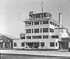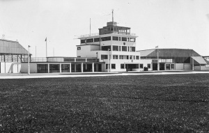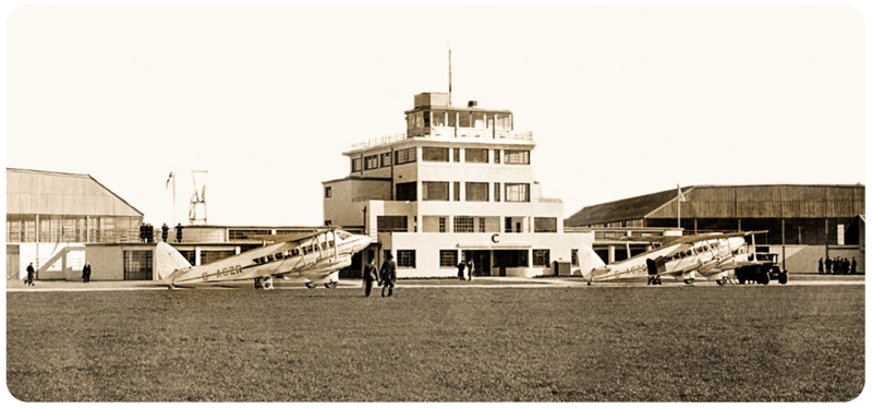1936: the airport is complete airside but work continues on the forecourt and hangar buildings. Cultivated fields in the foreground reach to within feet of the terminal building