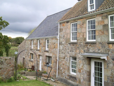 Front garden boundary wall in granite with brick piers and timber gate. Rear elevation of main house partly obscured by single-storey modern extension.