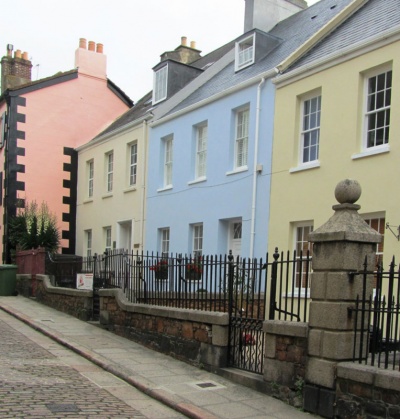 A fine early-mid 19th century townhouse, one of row of three similar houses, former merchant house facing St Aubin's bay, retaining original features of architectural and historic interest including front door and sashes. Set back from pavement behind low wall with railings and small front garden.