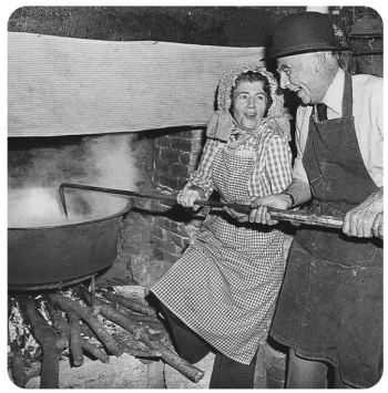 They were destined for la piêle, a huge brass preserving pan with a capacity of some ten gallons. It was set up on a tripod and a fire lit beneath. The recipe calls for a gallon of cider to be poured into the pan for every 70lb of apples, plus sugar, lemon and spices to give the mixture its distinctive flavour. Not surprisingly every farmer's wife would have her own individual recipe. The cider is kept simmering all day and the apples are added in the evening. From then on two or three men are employed non-stop stirring the mixture with un moueux, a wooden rake.