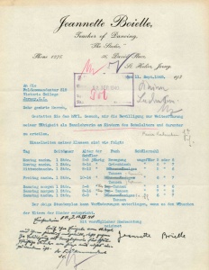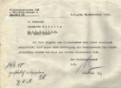 Jeannette Boielle, of The Studio, 56 David Place, was a popular dancing teacher in the 1930s and had to apply to the Germans for permission to continue their classes after the beginning of the Occupation. The left hand picture shows her application in English, that in the centre its translation into German, and on the right it the permit issued by the Feldkommandant's office [1]