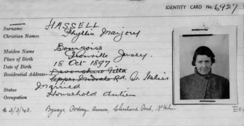 Occupation identity card details for Phyllis Marjory Hassell, nee Bourgoise (1897- )
