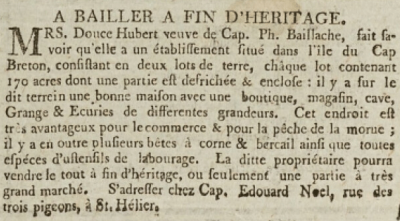 1811 Census Douce Balhache was residing at Plaster of Paris Cove in Guysborough County. She owned 11 cattle (one of the largest herds) as well as sheep and a horse.