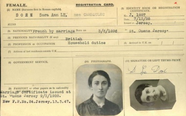 Dora Ann Le Dore, nee Carboulec's alien registration card. Although she was born in Jersey, Dora was required to register as an alien, having married a Frenchman