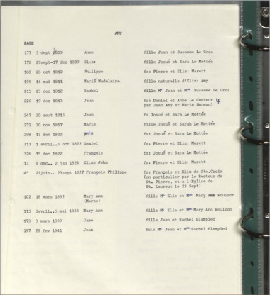 A sample page of Jersey Heritage family records, photographed in plastic sleeves in their ring binder files