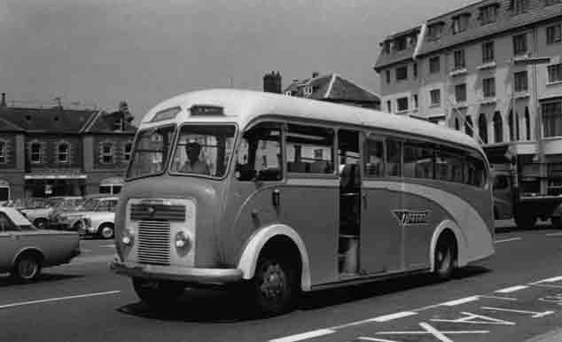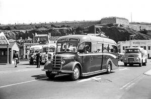 Driver Rene Gosselin with his Bedford OB Maple Leaf Tours coach at Greve de Lecq in the 1950s. Maple Leaf operated from 1954 to 1960, when their fleet was acquired by Len's Tours