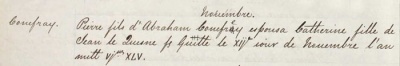 The 1645 marriage record of Pierre Conefray and Catherine Le Quesine in St John