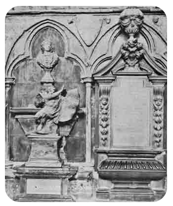 Philip de Sausmarez's monument by Sir Henry Cheere is in the North Aisle of the Choir. It is principally of white marble, with a background of red-veined Italian marble; and consists of a handsome pedestal, having scroll brackets at the angles, on which are two winged boys, or Genii, grouped with naval trophies; one of whom is removing the drapery from a Medallion of the deceased, and the other sitting weeping. Over the centre of the arch above are the family arms and supporters; and on the plinth is a basso-relievo of a sea fight. The centre of the pedestal displays a large shell, on which is the following Inscription: