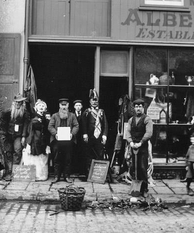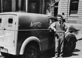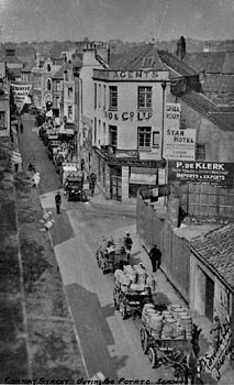 Potato lorries and horse-drawn vans queue in Conway Street during the height of the season