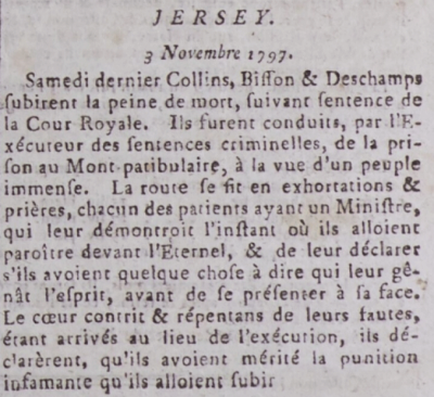 This cutting from the 4 November 1797 edition of the Gazette de l'Ile de Jersey records the public execution of three men, known only by their surnames, Collins, Bisson and Deschamps, on Mont Patibulaire - Gallows Hill, now known as Westmount.