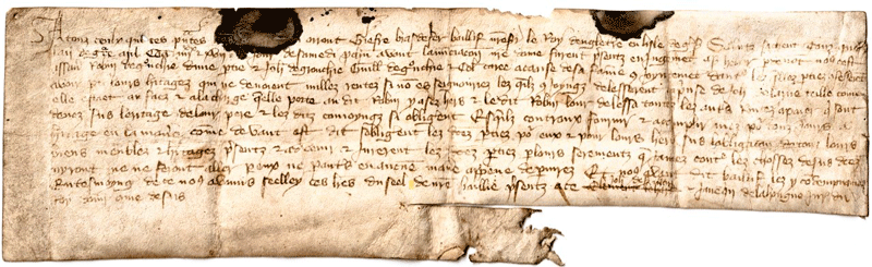 Robin de Gruchy, born about 1350, is mentioned as the eldest son in a `sous-partage`, or secondary property division, dated 1397, shown below. His co-heirs were his brothers Jean and Guillaume de Gruchy, who was, in all likelihood, the Guillaume mentioned below, in 1402, and an unnamed sister, married to Collas Carré. Robin, who was also mentioned in surviving deeds of 1420, displayed on the Baudains family page, and 1423, in both of which his name was spelt de Grouchy and 1437, is the earliest de Gruchy from whom modern members of the family can trace their ancestry. His family has been associated since the middle ages with La Chasse, which is situated in the north-east of Trinity. [13]