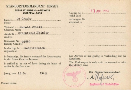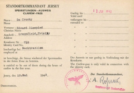 Curfew passes issued to brothers Edward and Harold de Gruchy during the Occupation as members of the Trinity Honorary Police [20]