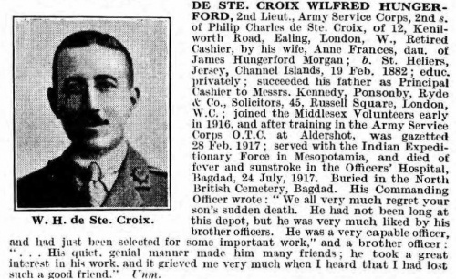 - Wilfred Hungerford de Ste Croix (1882-1917) son of Philip Charles and Anne Frances, 2nd Lieutenant RASC, died of heat stroke in Mesopotamia