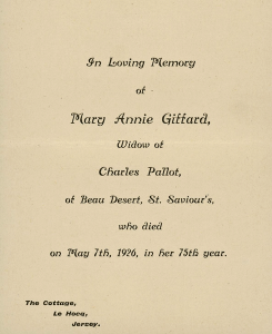 - 3 Charles Pallot (1832-1894) (Tr) [4] m (1872, St S) [5] Mary Ann Patty Giffard (1847-1926) daughter of Philippe (1817-1893) [6] and Mary Ann, née Bott (1826-1873), daughter of Nicolas and Marie Marguerite, née Delerée