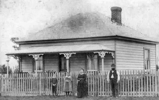 - ↑ See generation 7. Philippe and Esther Bisson's house in Otane/Kaikora North, on Bell Street, Otane, around the corner from their boot shop. In the picture are Mary Bisson, Esther Bisson, Philippe Bisson, and in the buggy are Samuel Walker and Elvina Bisson. This picture was taken on Samuel and Elvina's wedding day in the late 1890s. It was posted to the Old Central Hawkes Bay Facebook page by Lee Hickey (leecheries@gmail.com) and copied to Jerripedia's Facebook page in July 2022, with permission