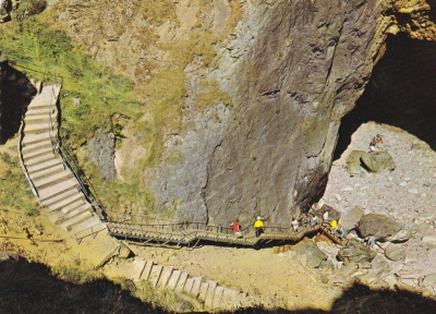 At high tide the cave floods and water is forced through the tunnel and out of the hole, creating a booming noise, which is a feature of many St Mary legends.