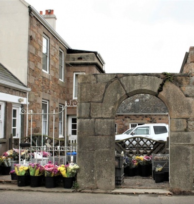 17th century nine stone Jersey round arch in the boundary wall, chamfered with crest on keystone.