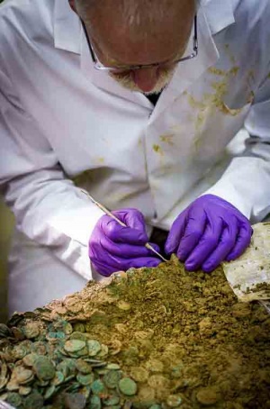 Conservator Neil Mahrer separating coins from the giant mass unearthed in a Jersey field