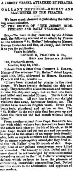 A newspaper report of how Clement Jean Dolbel, master of the schooner St Helier was attacked by pirates on the River Congo