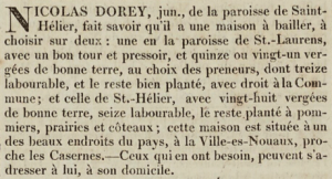 Edouard Dorey's 1803 advert in the Gazette de l'Ile de Jersey offering trees for sale. Presumably he assumed that every reader would know where to find him