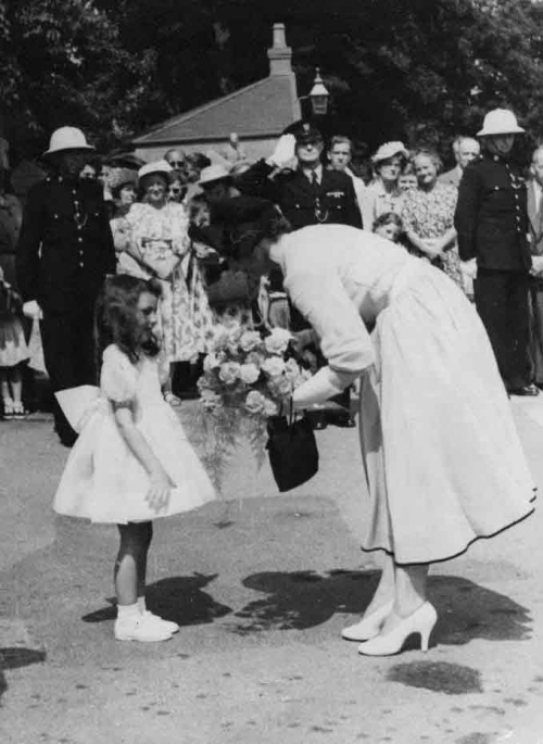 Mary Greenwell presents a bouquet to the Duchess of Gloucester at Victoria College in 1952
