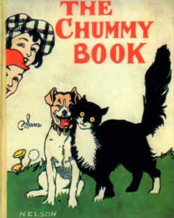 Commissions for two other books in the series soon followed: Two Little Scamps and a Puppy by Angela Brazil (TN22), commissioned in September 1918, and John's Visit to the Farm by Evelyn Sharp (TN24), commissioned in December 1918. All these books were published in 1919 and then reprinted, without the original cover illustration, in at least three different formats until at least 1935. The first two, in the Little Folks Series, used the original internal colour illustration for the wrapper and were bound either in Nelson's characteristic decorated cream cloth, or in cheaper decorated blue boards of imitation cloth.