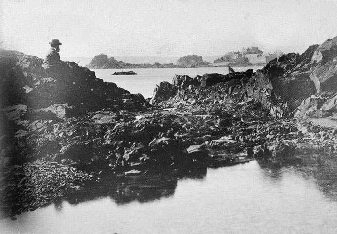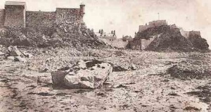 These two photographs were taken around 1872, when work was under way to construct a new and massive harbour for St Helier. One arm was built out from Elizabeth Castle, bridging the gap to the Hermitage Rock and then heading out to sea. That was completed. The other arm, from La Collette, was repeatedly damaged by winter storms before much progress could be made and the whole project was abandoned. These picture were taken while work was under way outside the castle and show temporary buildings which were part of the construction site. In the foreground on the left is a large basin which was probably the inner section of the castle's harbour, little of which now remains. It appears that a retaining wall was built to keep the tide out and the whole area was soon filled in, as shown on the right, to create an open space where the giant blocks which would be used to build the breakwater could be constructed and stored