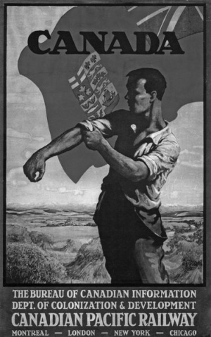 in Canada Last big block of the Canadian Pacific Farm Lands. You can secure at low cost a farm in Western Canada that will make you rich and independent. Never again on the American continent will farmlands be offered at prices so low. The block contains both fertile, open prairie and rich parklands in Lloydminster and Battleford Districts of Central Alberta and Saskatchewan. Farmlands on the rich prairies of Manitoba, Saskatchewan and Alberts are $11.00 to $80 an acre. Lands in Southern Alberta under an irrigation system of unfailing water from $50 an acre. Twenty years to pay. The Canadian Pacific offers you this land under a plan of easy payments. You pay down 10%. Then you have no payment on the principal until the end of the fourth year, then fifteen annual payments, Interest is 6%. To Ex-Servicemen – Ask the CPR for information about their scheme for assisted colonisation for ex-soldiers, sailors and airmen. The Lloydminster and Battleford land are admirably adapted for the formation of colonies of demobilised men. Personally conducted parties for home seekers and full information. Send today for complete information – free of cost. Canadian Pacific Railway, 62-65 Charing Cross, London, SW1 or local agents. ---------