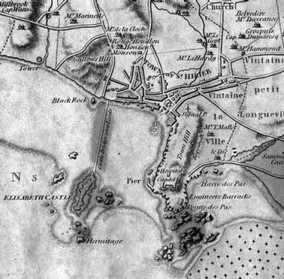 In 1758 an Order in Council included proposals from the Board of Ordnance for the defences of the Island noting that ‘whereas it has been this day humbly represented to His Majesty that the poverty of the inhabitants of the Island is as to render them unable to finish at their expense the Lines (a connected series of fieldworks) upon St Helier’s Hill’.