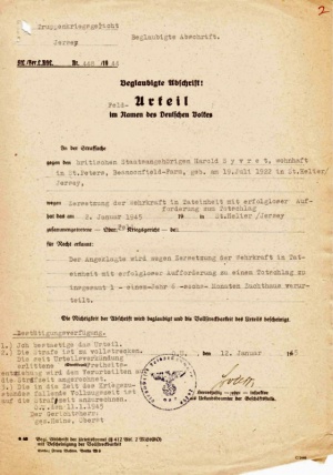 The German record of the case involving Una Sheail, of Beaconsfield Farm, sent to prison for three months in 1945 for attempting to escape from the island. There must have been considerable unrest at this farm at the time because the records also show that Harold Syvret, of the same address, was sentenced to 18 months for 'attempting to create disagreement among armed forces and incitement to violence'. He was lucky that this came so late in the war because before June 1944 such a sentence would have involved deportation to a prison or concentration camp in Germany, and few who made the journey for sentences of this length ever returned