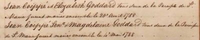 There were two Goddard marriages in St Mary in 1788. On 20 April Elizabeth Goddard married Jean Coippe. A fortnight later, on 4 May, Jean Coippe Snr, probably father of the other Jean, married Magdalene Goddard. Her relationship to Elizabeth is uncertain. There are no baptism records for Goddard or Godard in St Mary, but Susanne and Elizabeth seem to have been born in St Ouen and St Peter, respectively, in 1752, with different parents. So they were not sisters, but may have been cousins.