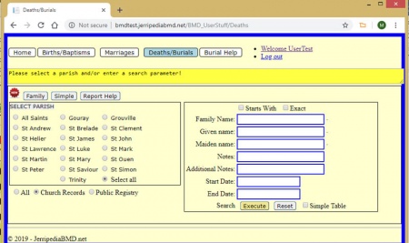 The only problem you might encounter if you are using the Family Search facility extensively is that the system will time you out of a search and return you to the main page. No problem! Just click on Baptisms, Marriages or Burials, where you want to resume your search and your original search criteria and results of the last search are still there. These results are even retained when you login again tomorrow!