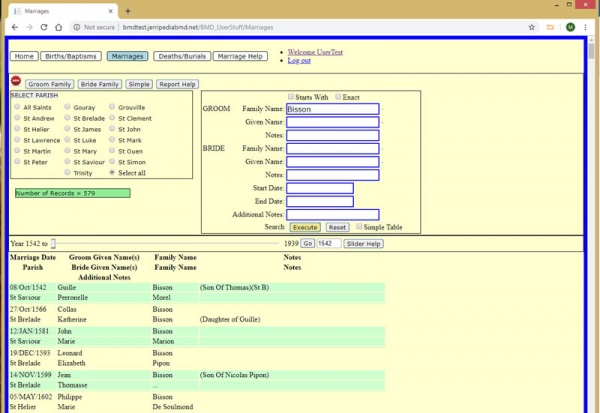 Sometimes you may think you know the name you are looking for, but other surnames come up in the search, including the same letters. A good example is Gruchy. If you search for a groom with that name, you will get over 700 results, many of them for de Gruchy. So tick the Exact box at the top of the search form and that will yield just 227 Gruchy records.