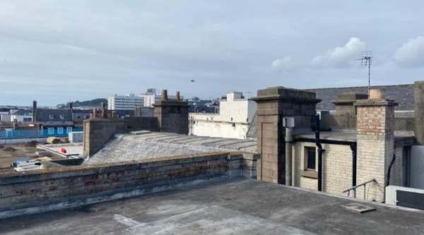 These two photographs taken from Fort Regent show the roof of the former Halkett House, which is still standing but largely incorporated into the commercial property surrounding it, formerly the Woolworth store. The roof of the building and its four chimney stacks are in the centre of both 21st century photographs. The picture on the left shows the top of the King Street facades of what were Woolworth (left) and Burtons The taller building behind Halkett House in the left picture was built in the 19th century and the lane running to the left of them was called Rue de Dinan.