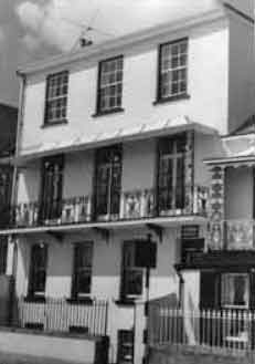 First floor verandah under concave metal roof, elegant ironwork balustrade and pillars incorporate heads and anthemion designs. Granite steps to door. Set behind rendered low wall with dressed granite coping with iron railings and gates shared with neighbour. Lower building to east. Front elevation: pitched slate roof, elevations rendered. First floor verandah partly under concave roof, partly extended to roof of ground floor extension; elegant ironwork balustrade and pillars incorporate heads and anthemion designs. Each villa retains its original staircase.