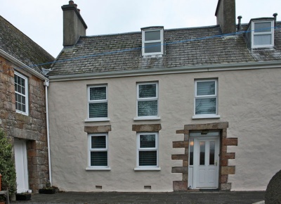 Three-bay cottage on west side with side passage on east side leading to square chamber at back, housing 19th century staircase with mahogany handrails, turned newel posts and new ironwork balustrade. First floor rooms have low ceilings.