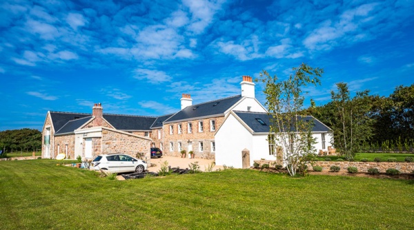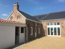 All outbuildings match with slate roofs and pierre perdu mortar.