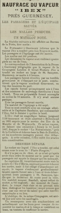 On this occasion Le Feuvre’s first officer John Baudains, a Jerseyman. He was to become captain of the Ibex and was to figure largely in the vessel’s next, and more serious, wreck off Guernsey on the morning of Friday, 5 January 1900. The vessel struck a glancing blow on the Platte Fougere, a rock three miles north of the island, at 6.15. The caused much damage to the starboard side, but the 34 passengers were not really aware of how serious the strike had been until they were summoned on deck and lifebelts rapidly served around and the vessel was abandoned as she gradually sank until only the tops of the funnels were out of the water.