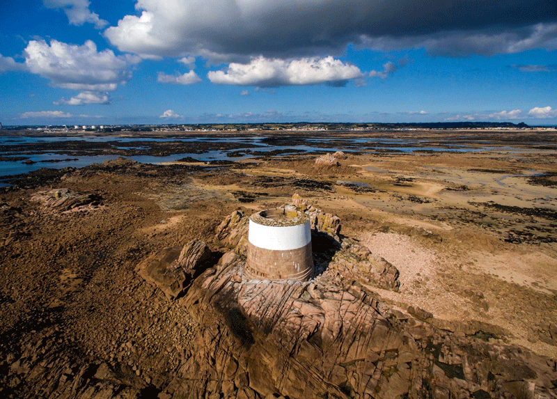 The first men were stationed there in 1811. Situated about a mile and a half out to sea off the Platte Rocque this tower cost £6,263 to build, was 8.53 metres in height, and was armed with a 24pdr long gun on a traversing platform. The magazine could contain up to 40 barrels of gunpowder and had accommodation for an officer and twelve men. A report of 1840 stated that it was armed with 1 x 24pdr on a wooden traversing carriage, had a magazine for forty barrels of powder and accommodation for one officer and twelve men. It also had a water tank to take 2,268 gallons. The States bought the tower on 26 July 1922 for £80. It was occupied by German troops during WWII as a look-out.