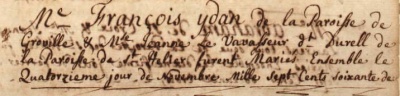 Francois Ydan married Jeanne Le Vavasseur dit Durell in St Helier in 1762