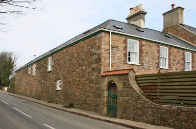 The stone boundary wall incorporates a chamfered Jersey round arch (possibly reused from an earlier building).