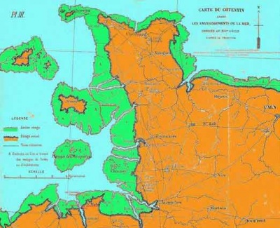 A map published by Deschamps-Vadeville in France in 1714 purports to show Alderney connected to the Cherbourg end of the Cotentin peninsular by a strip of land, Guernsey linked to Sark and forming a single island several times its present-day size, Jersey linked to France, and surrounded by coastal plains on its north, west and south sides, the Minquiers forming an island about three times that of Jersey today, and the Chausey Islands also linked to France. This map is said to be based on an earlier chart of AD1404, found at Mont St Michel, which was in turn based on a 9th century manuscript.